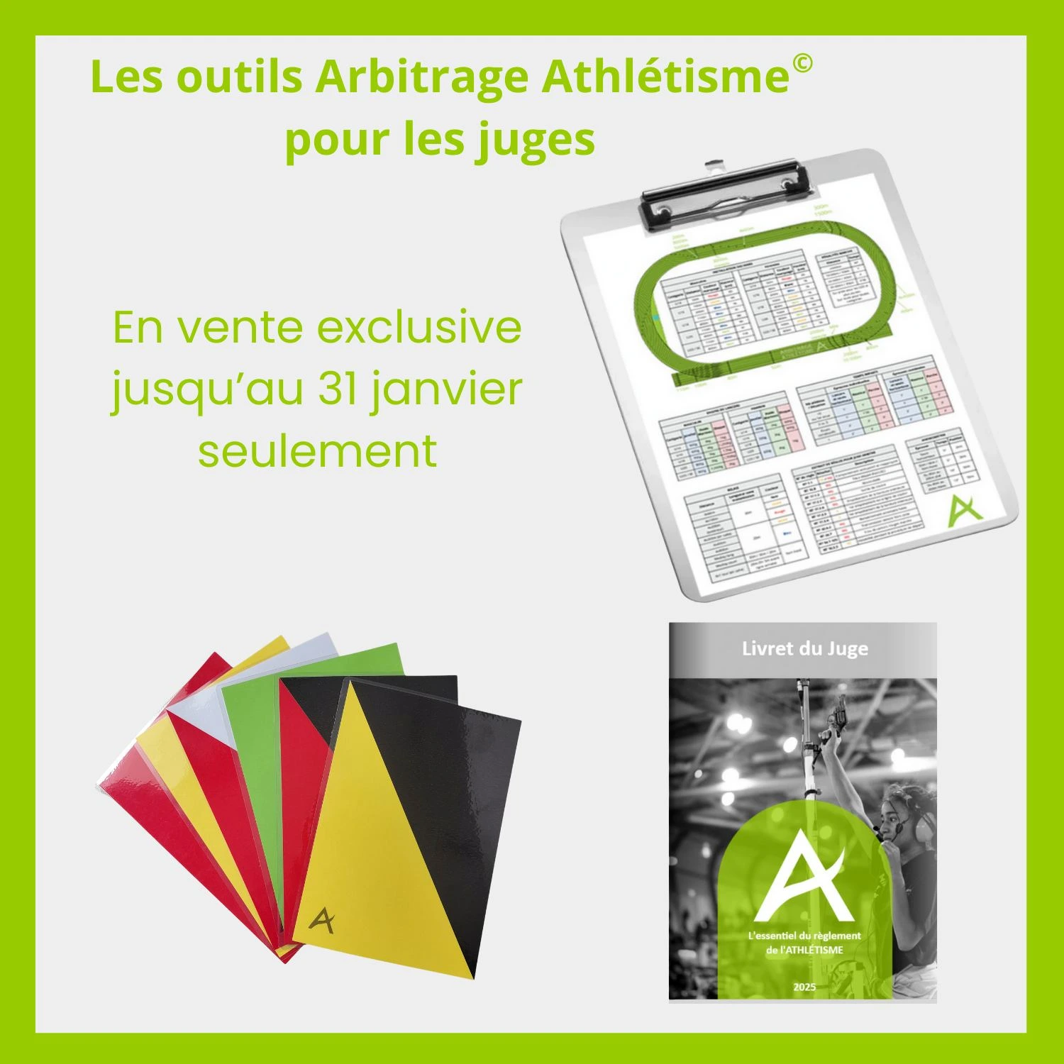 🚨 [VENTE FLASH] Vous avez jusqu'au 31 janvier pour vous équiper avec la boutique Arbitrage Athlétisme ! 🤩 Planche antisèche durable, livret avec l'essentiel du règlement, cartons pour starter/juge-arbitre, des outils développés par des officiels, pour des officiels. ➡️ https://www.helloasso.com/associations/arbitrage-athletisme/boutiques/planches-et-cartons 📝 Vous êtes un comité ou une ligue ou hors métropole et vous voulez commander ? Contactez-nous directement pour un devis personnalisé.
